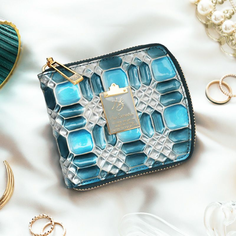 【HerSchedule】チェレットbillfold(二つ折りウォレット)シリーズ 青の傑作。3色のめずらしいニュアンスブルーが綺麗に調和した特別色の財布「ブルーシンフォニー(Blue Symphony)」オリジナルエナメルレザー インペリアルスイートシリーズ 二つ折りラウンドファスナーウォレット (ハースケジュール)