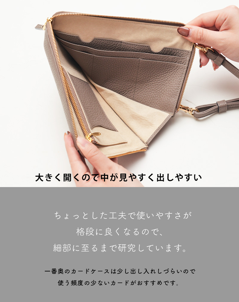 ■サイズ 横:約12cm 縦:約19cm 厚み:約2cm(タック部分含む)約15cm(底部分) *ショルダーベルトの長さ:無段階調節可能 *サイズは外寸です ■重さ 245g ■素材 外装:牛革 内装:牛革 スウェード調の布帛 ■モデル身長:161cm |