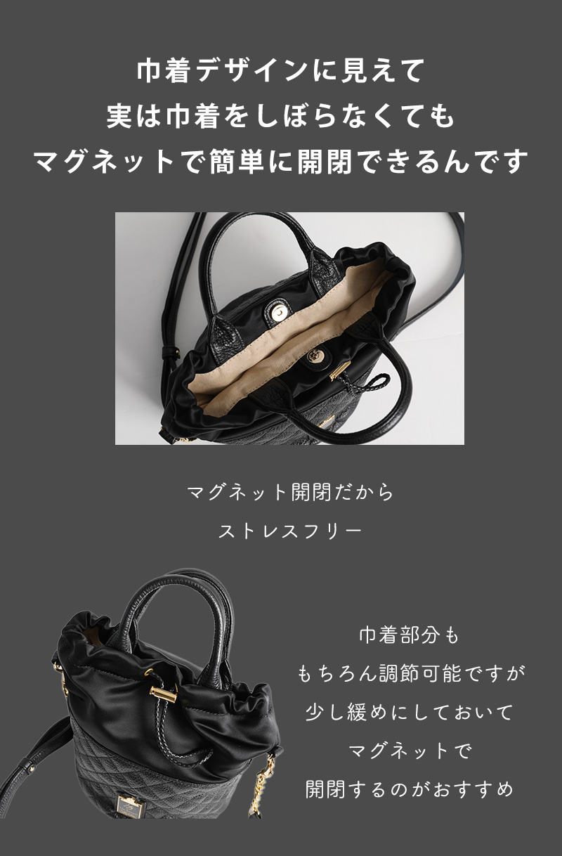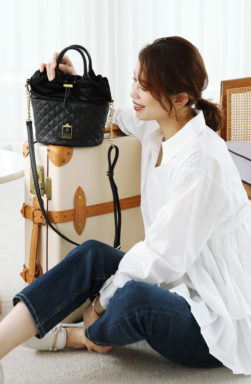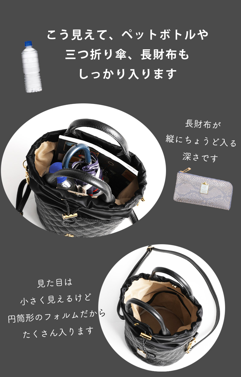 ■サイズ 底直径:約16cm 縦:約24cm(持ち手含まず) 持ち手高さ:約9cm *ショルダーベルトの長さ:無段階調節可能 *サイズは外寸です ■重さ 410g(ショルダーベルトを付けた場合) ■素材 外装:生地×牛革 内装:牛革 スウェード調の布帛 ■モデル身長:161cm |