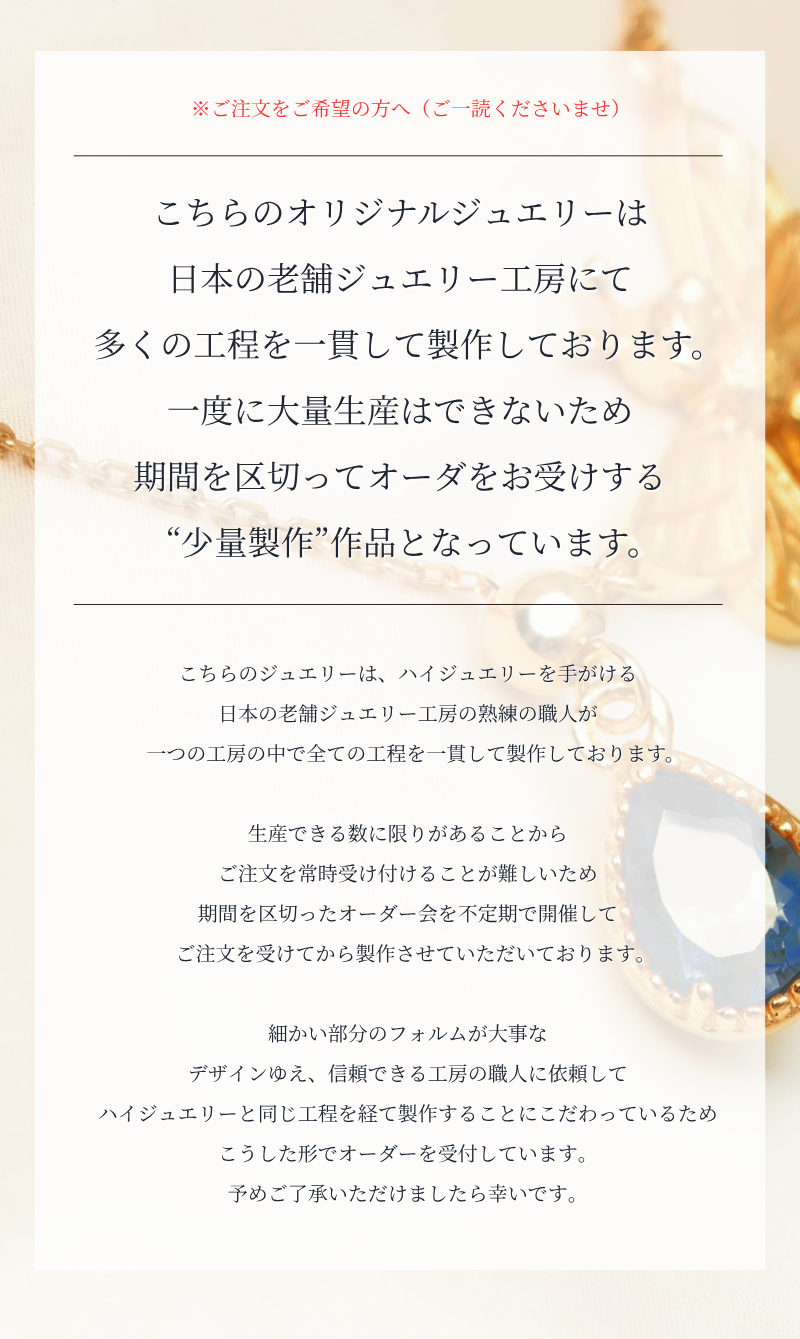 こちらは日本の老舗ジュエリー工房にて原型、キャスト、石留め、仕上げまでを一貫して製作しており、大量生産はできず少量製作となっております。