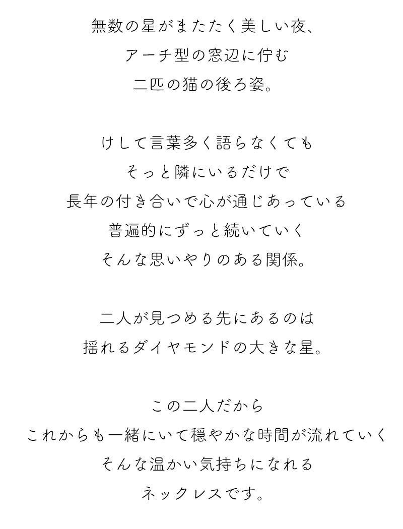 ■サイズ 本体 モチーフ部分高さ:約20mm 幅:約1.6mm チェーン長さ:最長45cm(フリーアジャスター付き無段階調節可能) *無段階で調節可能なので、最短にした場合はチョーカーのように短く使っていただくことも可能です。最長で45cmになるのでタートルネックなどのお洋服にも合わせていただけます。襟ぐりの開き具合に合わせて無段階で調整できるのでどんなお洋服にも合わせやすいです。 *サイズは外寸です ■素材 シルバー925(SV925)製純金(24K)厚付けコーティング 天然ダイヤモンド1石(2mmサイズ) 天然ムーンストーン1石(1mmサイズ) ■製造国 日本 *ギフトボックスのデザイン等につきましては、予告なく多少の変更をさせていただく可能性がございます。予めご了承いただければ幸いです。 |