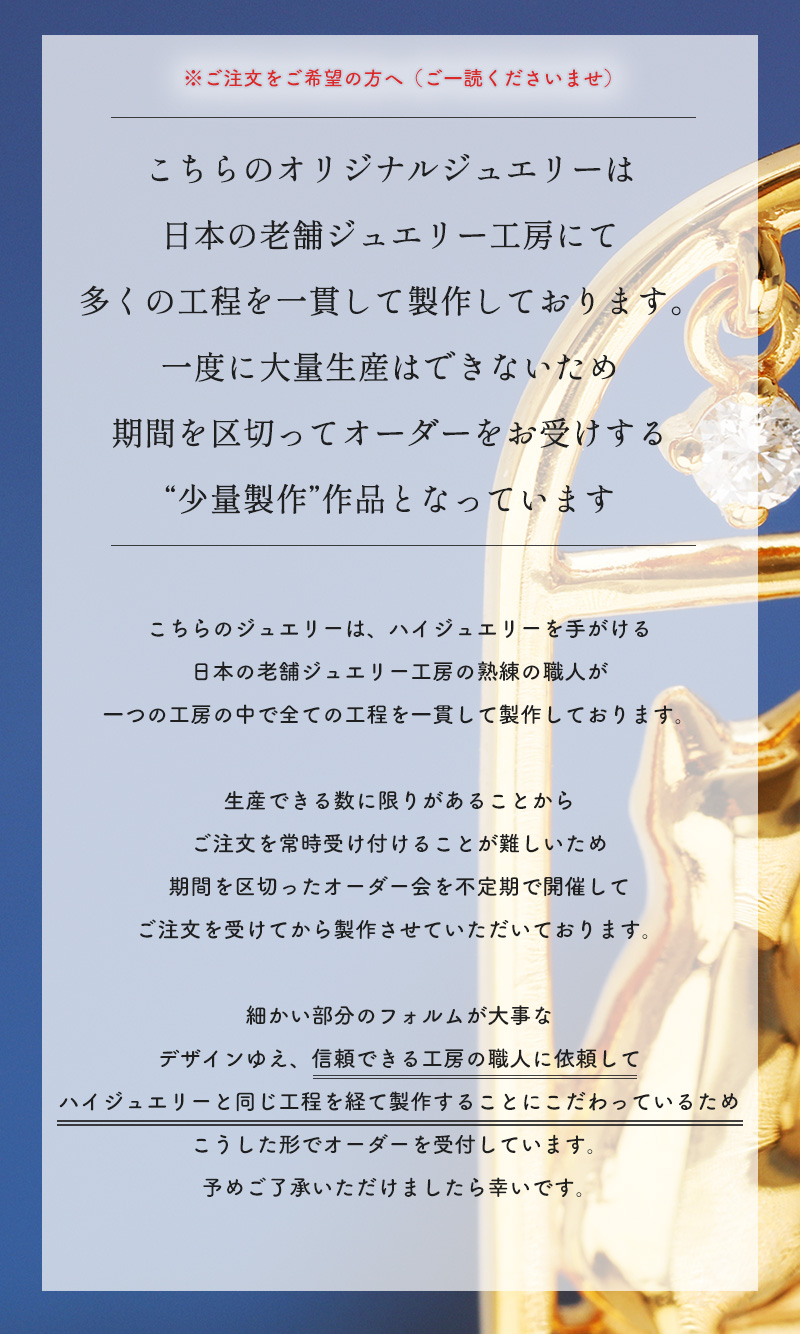 こちらは日本の老舗ジュエリー工房にて原型、キャスト、石留め、仕上げまでを一貫して製作しており、大量生産はできず少量製作となっております。