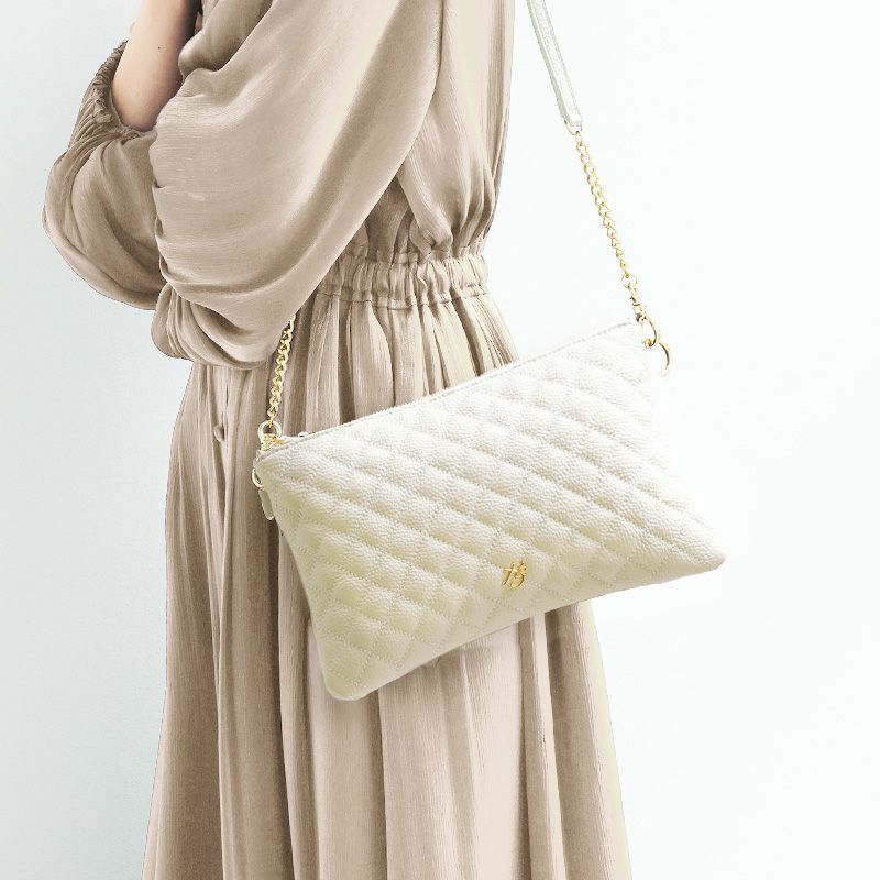 【HerSchedule】旅好きな母のために作った「旅のパートナーポシェット」3部屋構造で驚くほど整理しやすい理想的な旅バッグ TrinityNote(トリニティノート)エレガンスパール キルティングレザー アイボリー ショルダーバッグ 雨の日にも持てる汚れや水に強い撥水イタリア革(ハースケジュール)