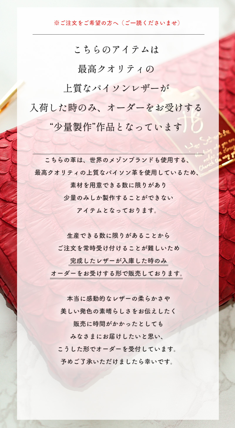 ■サイズ 横:約20cm 縦:約9.5cm 厚み:約1.5cm > *サイズは外寸です ■重さ 130g ■素材 外装:パイソン革 内装:コインケース、カードケース部分:牛革 スウェード調の布帛 ■モデル身長:161cm |